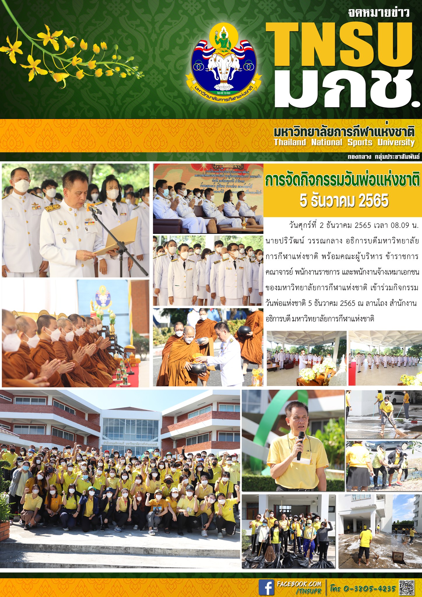มหาวิทยาลัยการกีฬาแห่งชาติ จัดกิจกรรม Big cleaning day ทำความสะอาดสำนักงาน และที่พักอาศัยในวัน ศุกร์ ที่ 2 ธันวาคม 2565 เพื่อพัฒนาคุณภาพชีวิต สร้างความสามัคคีและบรรยายกาศที่ดีในการทำงานร่วมกัน ส่งเสริมให้บุคลากรมีความรัก ความสามัคคีและสร้างความผูกพันต่อองค์กร