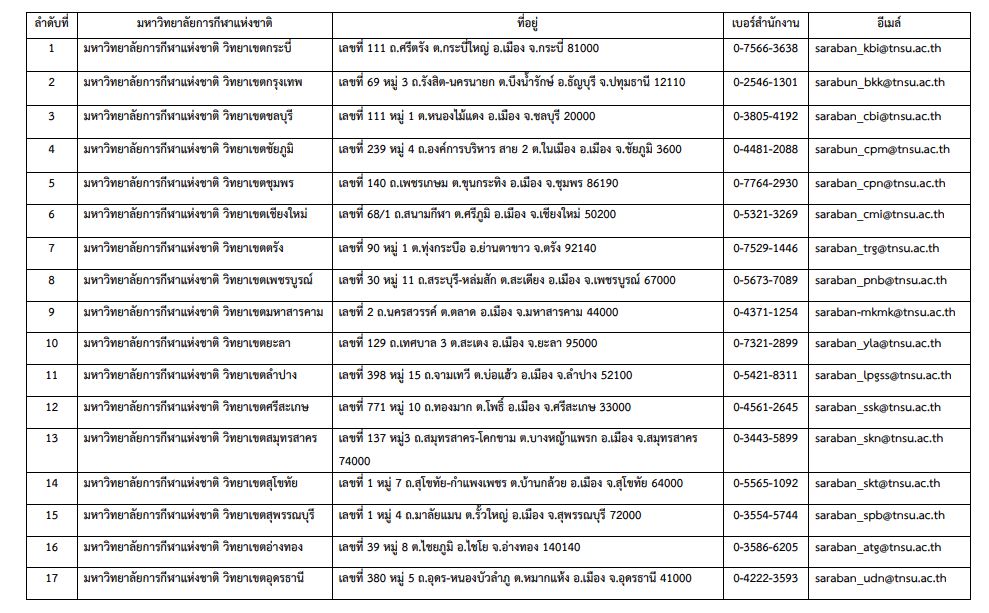 สำนักงานอธิการบดีมหาวิทยาลัยการกีฬาแห่งชาติเลขที่ 333 ถนนสุขุมวิท ตำบลหนองไม้แดงอำเภอเมืองชลบุรี จังหวัดชลบุรี 20000